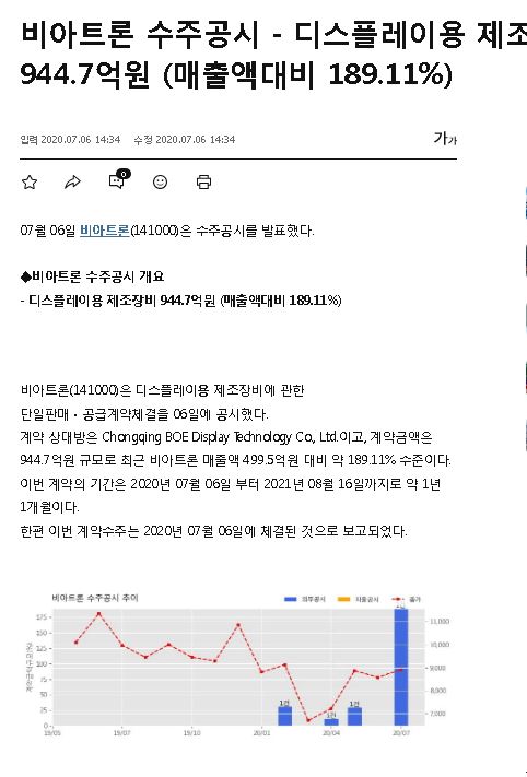 NEWS 비아트론, 디스플레이 열처리 기술 보유...신기술 개발 추진-NICE평가정보 22.01.21 NEWS 비아트론, 63억 규모 디스플레이용 제조장비 공급계약 22.01.04 NEWS 비아트론, 148억원 규모 공급계약 체결 21.12.24 NEWS 영업이익 341.6% 껑충 뛴 반도체 업체 비아트론, 수원 부동산 취득한 까닭 21.04.08 NEWS 비아트론, 본격적인 투자 확대…안정적 성장 전망-유안타 21.02.17 NEWS 리서치알음 “비아트론, 반도체 장비 사업성과 본격화 기대” 21.02.01 NEWS [fn종목 돋보기] 비아트론, 100% 자회사 인터밸류 '엑시트' 주목...알체라 지분 부각 20.12.23 NEWS 비아트론, LG디스플레이와 69억 규모 계약 20.11.13 NEWS 비아트론 수주공시 - 디스플레이용 제조장비 944.7억원 (매출액대비 189.11%) 20.07.06 NEWS 비아트론 수주공시 - 디스플레이용 제조장비 146.9억원 (매출액대비 29.40%) 20.05.14 NEWS 비아트론, 55억원 규모 디스플레이용 제조장비 공급계약 체결 20.04.03 NEWS 비아트론' 10% 이상 상승, 기관 7일 연속 순매수(5.6만주) 20.03.20
